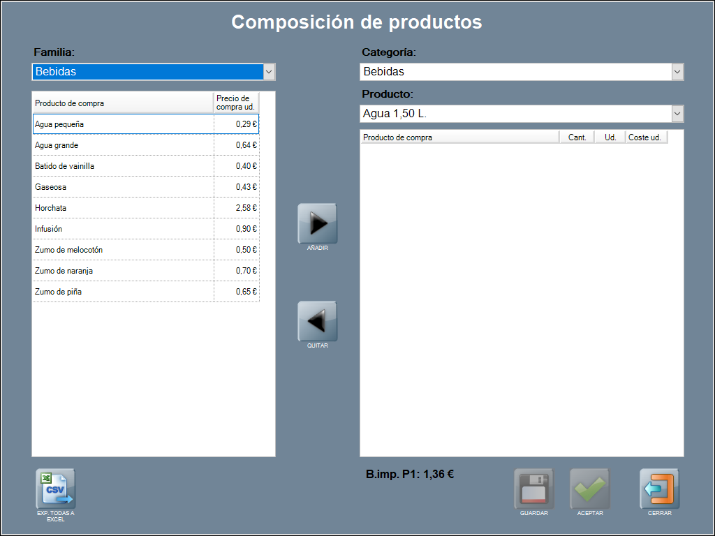 Básicamente, lo que hay que hacer es buscar los productos de compra (filtrando por familias con el desplegable) y añadirlos al producto de venta (con la flecha), para que estén correspondidos. Sin olvidar indicar en la columna cantidad (cant.), la cantidad de producto de compra que se utiliza.