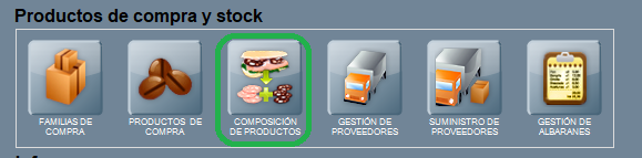 Para acceder a la composición de productos pulsa COMPOSICIÓN DE PRODUCTOS en Panel de gestión / Productos de compra y stock.
