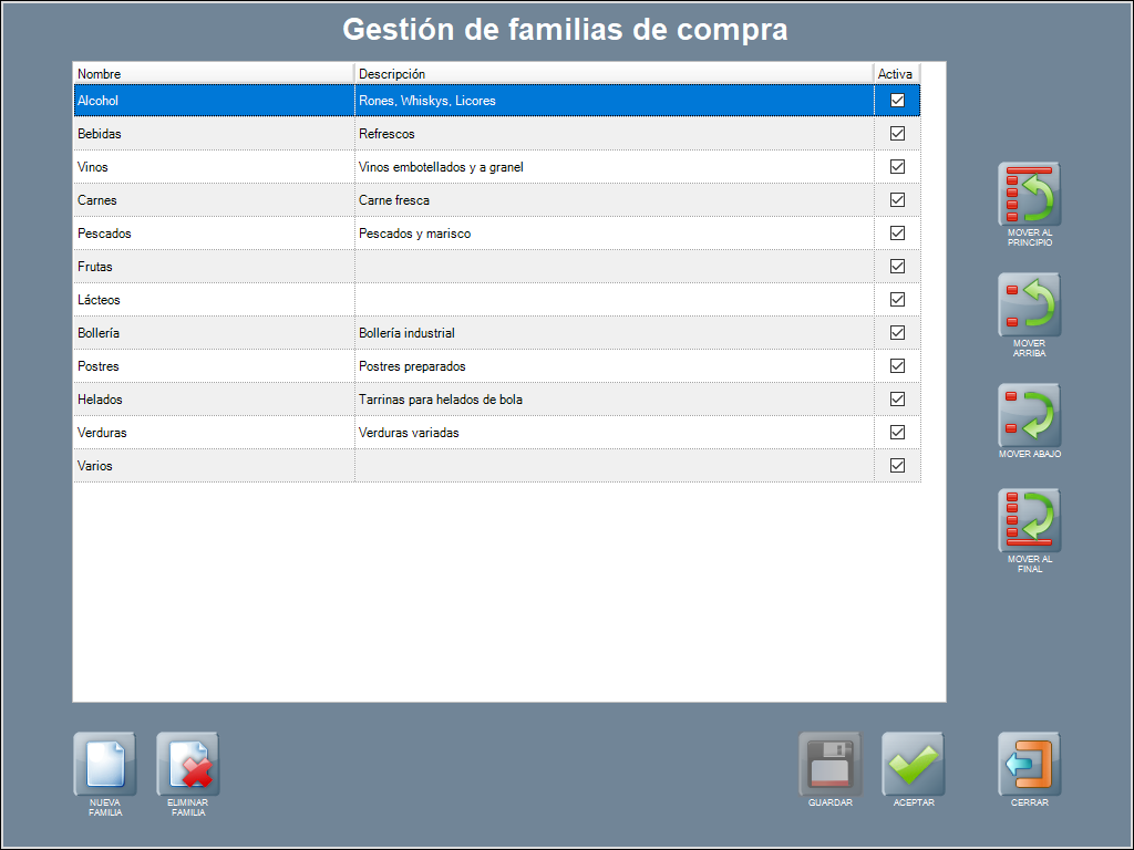 La gestión de familias y productos de compra en el TPV Hosteltáctil® Pro es bastante sencilla y directa.