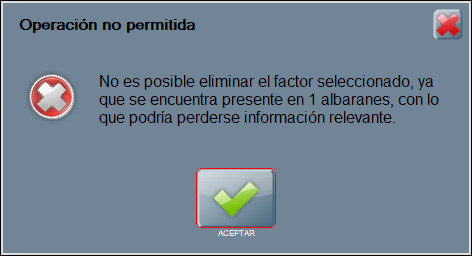Para eliminar un factor pack de un producto de compra, utiliza ELIMINAR FACTOR, y ACEPTAR. Por favor, ten en cuenta que no es posible eliminar un factor que ya ha sido utilizado en albaranes.