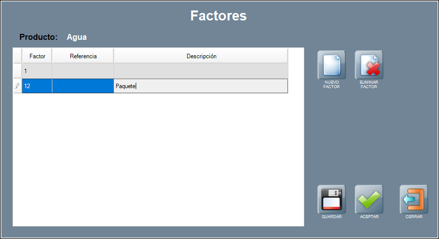 Para acceder, con el producto seleccionado, pulsa FACTOR PACK. Se abre la ventana de Factores.