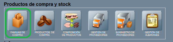 Para acceder a Familias de compra utiliza FAMILIAS DE COMPRA, situado en Panel de gestión / Productos de compra y stock.