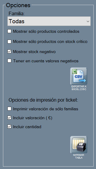 El informe de stock tiene varios filtros para las familias y la configuración de impresiones, que explicamos seguidamente.