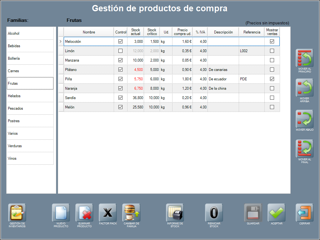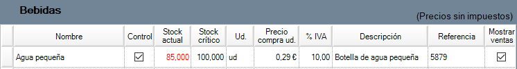 Stock actual: las existencias del producto, si está por debajo del stock crítico aparece en rojo (cómo en el ejemplo).