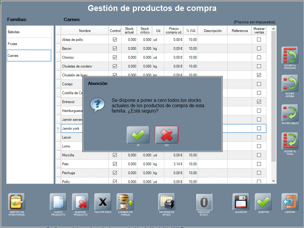Para poner el campo stock actual a cero para todos los productos de una familia, pulsa REINICIAR STOCK.