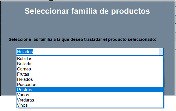 Para cambiar la familia de un producto de compra, utiliza el botón CAMBIAR DE FAMILIA, se abre la ventana Seleccionar familia de productos, selecciona la familia a la que quieres trasladar el producto y ACEPTAR.