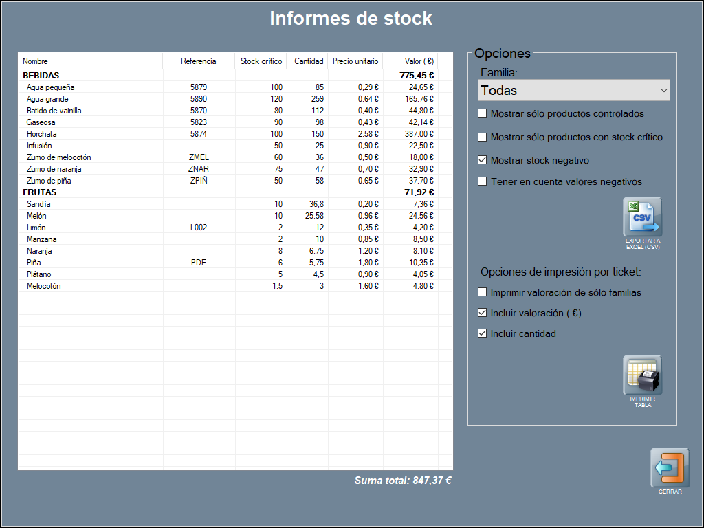 Las existencias se listan en modo tabla con los siguientes campos: nombre (del producto de compra y la familia a la que pertenece), referencia, stock crítico, cantidad (existencias), precio unitario (sin impuestos), valor (€) (cantidad por precio unitario). Y en color blanco a pie de tabla, la valoración de la suma total en euros.