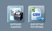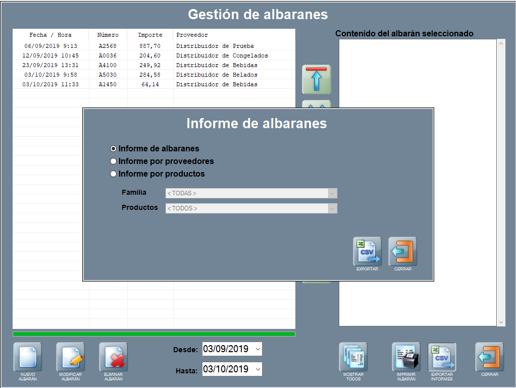 Para listar informes a tu gusto y guardarlos en disco duro o soporte externo utiliza EXPORTAR INFORMES. Al pulsar este botón se abre la ventana de Informe de albaranes, donde puedes exportar varios tipos de informes: informes de albaranes, de albaranes por proveedores (con el acumulado para cada proveedor) y/o por productos (con selección para familia y producto).