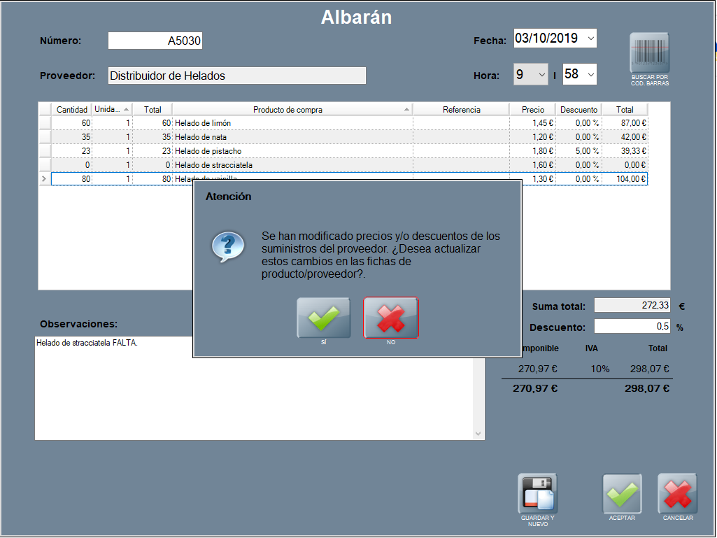 En el momento de finalizar el albarán, al GUARDAR Y NUEVO o ACEPTAR, si se han modificado precios o descuentos, el sistema pregunta por si quieres actualizarlos en suministros de proveedor para tener al día la plantilla de compra de dicho proveedor.