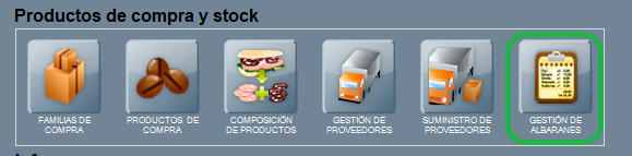 Para acceder a la gestión de albaranes pulsa GESTIÓN DE ALBARANES, en Panel de gestión / Productos de compra y stock.