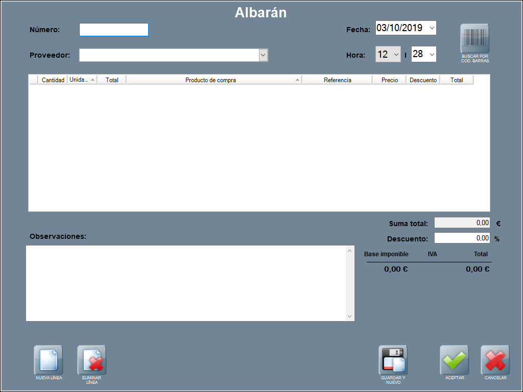 Se abre la ventana de albarán, con los campos en blanco para poder ir rellenándolos. Excepto la fecha y la hora que toma la del la día en curso, y puedes cambiar más tarde.