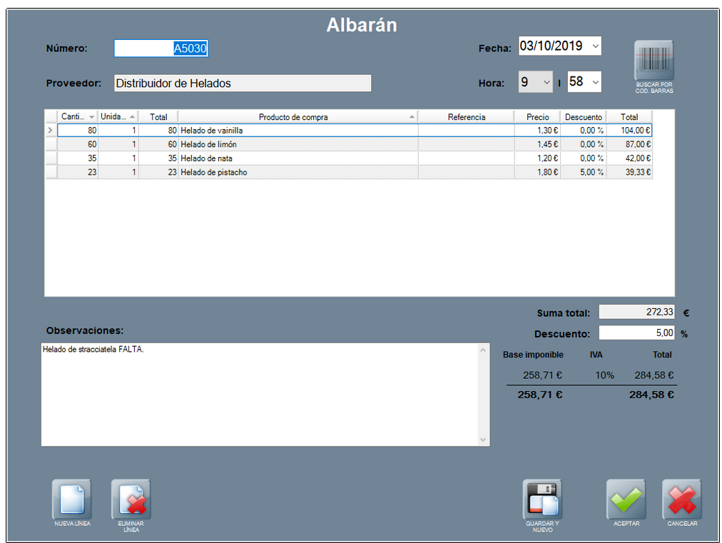 La ventana de albarán, además, muestra la valoración por línea y de la suma total, el descuento aplicado, la base imponible, porcentaje de IVA, total y los descuentos aplicados para cada línea, que afectan al importe total de la fila del producto.