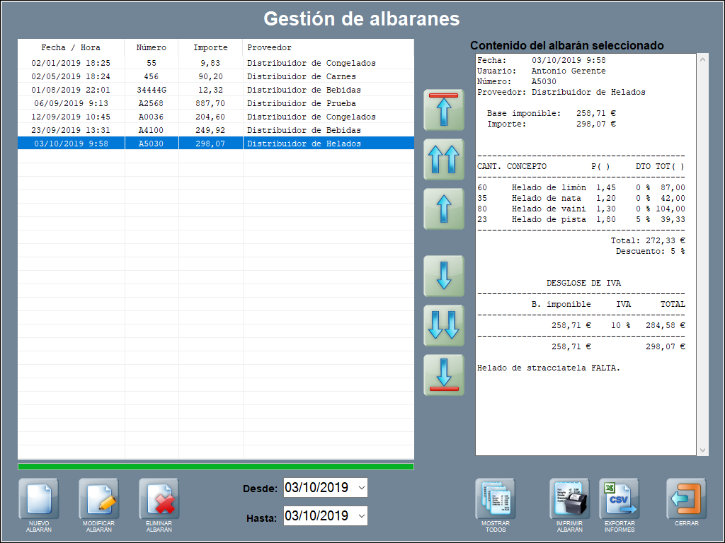 Con la lista de albaranes en el panel de la izquierda, en forma de tabla con columnas que muestran la siguiente información: fecha/hora, número, importe y proveedor. Pincha sobre el nombre del campo en la fila del encabezado para ordenarlas. Y en el panel de la derecha, el detalle con la previsualización del contenido del albarán seleccionado.