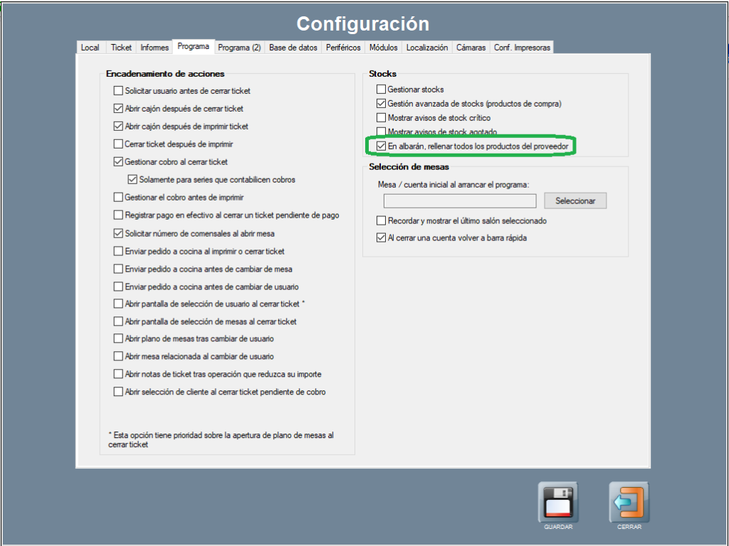 En Hosteltáctil® Pro puedes configurar dos formas diferentes de trabajar con albaranes, desde el apartado Stocks, en Panel de gestión / Configurar opciones / Programa.