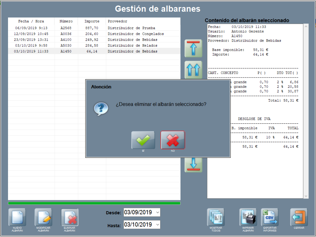 La ventana de gestión de albaranes, dispone de un filtro por fechas desde – hasta, que muestra por defecto hasta el día en curso y el mismo día del mes anterior.