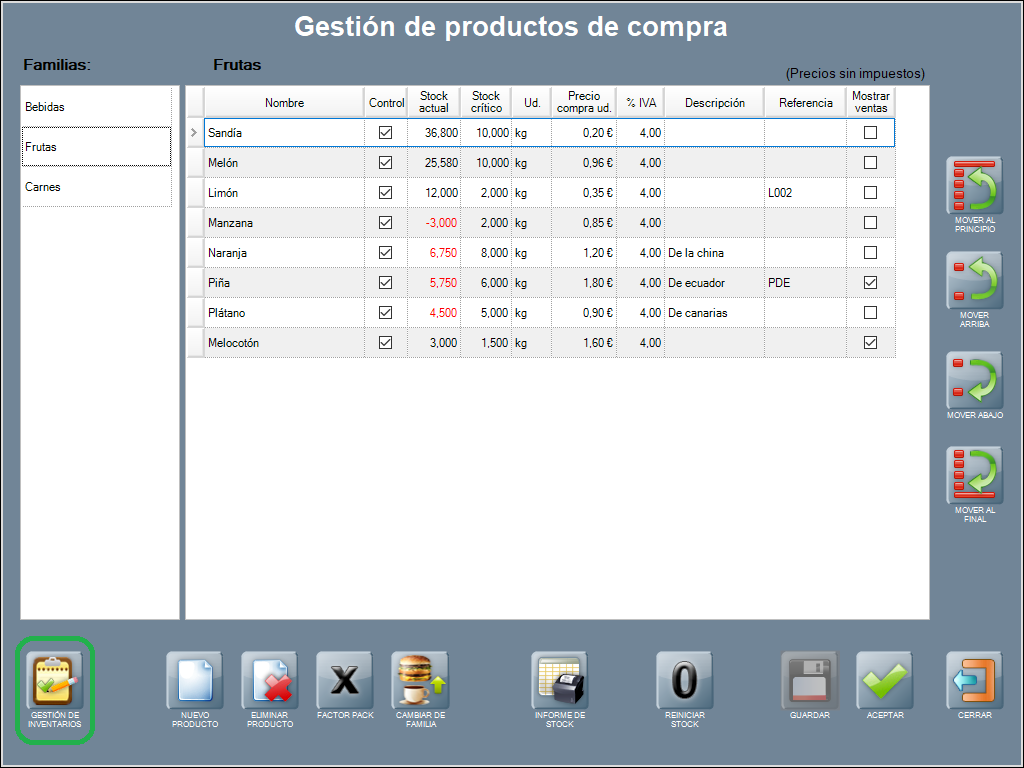 Para proceder a la gestión de inventarios pulsa GESTIÓN DE INVENTARIOS en la ventana de Gestión de productos de compra, a la que puedes llegar con PRODUCTOS DE COMPRA desde Panel de gestión / Productos de compra y stock.