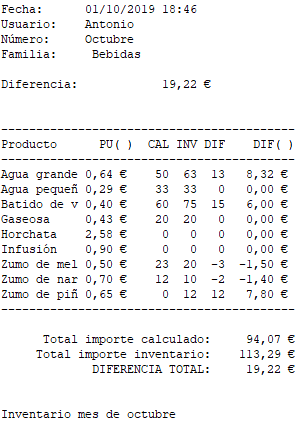 - si el ‘valor del total importe calculado’ es mayor que el valor del ‘total importe inventariado’, la cifra del campo ‘diferencian total’ será negativa (se deduce que menos existencias, en relación a las que dice el sistema).