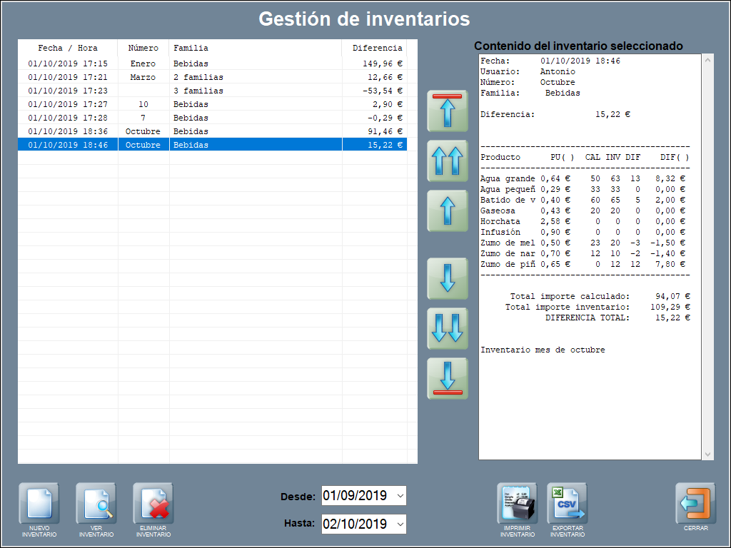 A la izquierda, en el primer panel la lista de inventarios realizados dónde cada línea es un inventario, en modo tabla con los siguientes campos: fecha y hora del inventario; número (el campo es alfanumérico, puedes escribir lo que quieras para identificar el inventario); familia (si es más de una lo indica: 2 familias, 3 familias, 5 familias, etcétera); y diferencia (que es la diferencia (en €) resultante entre el valor económico (en €) de productos calculados según stock y el valor económico (en €) de los productos inventariados).