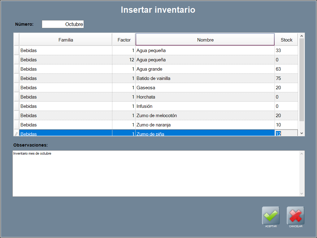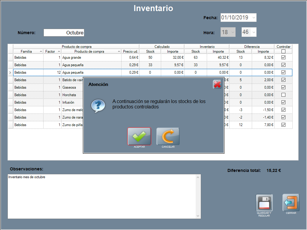 Una vez completadas todas las líneas con cantidades de producto o existencias, pulsa ACEPTAR. Obviamente, los productos sin stock se quedan a 0.