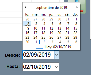 La ventana de Gestión de inventarios dispone de un único filtro por fechas desde – hasta, que puedes escribir manualmente o buscar con el calendario. Por defecto, muestra desde el mismo día del mes anterior hasta el día en curso.