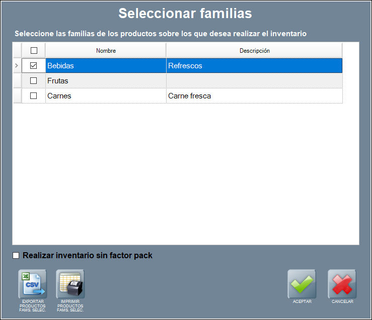 Para insertar un nuevo inventario pulsa NUEVO INVENTARIO. Luego, se abre la ventana de Seleccionar familias, con el listado de las familias activas e inventariables.