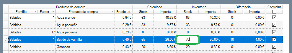 - si el valor del ‘total importe inventariado’ es mayor que el valor del ‘total importe calculado’, la cifra del campo 'diferencia total' será positiva (esto es, el recuento tiene más existencias, de las que dice el sistema).
