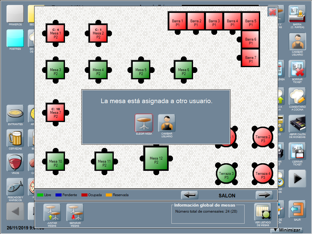 Y en el plano de mesas se indicará que la mesa está asignada a otro usuario, y se dará la posibilidad de ELEGIR MESA o de CAMBIAR USUARIO.