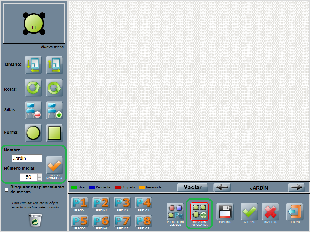 Nombre y número inicial de mesa: son el prefijo y el número de la mesa. Esta opción puede usarse antes de crear la mesa, de forma que las mesas nuevas lleven ese prefijo y esa numeración, o seleccionadno una mesa ya creada, y pulsando sobre APLICAR NOMBRE Y Nº. De hecho, se pueden generar nuevas mesas con el número que se desee.