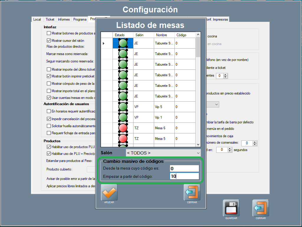 Para asignar de forma masiva un código a cada mesa, indica el código de la mesa desde, y el código a partir de cual se empezará a asignar. Luego, APLICAR.