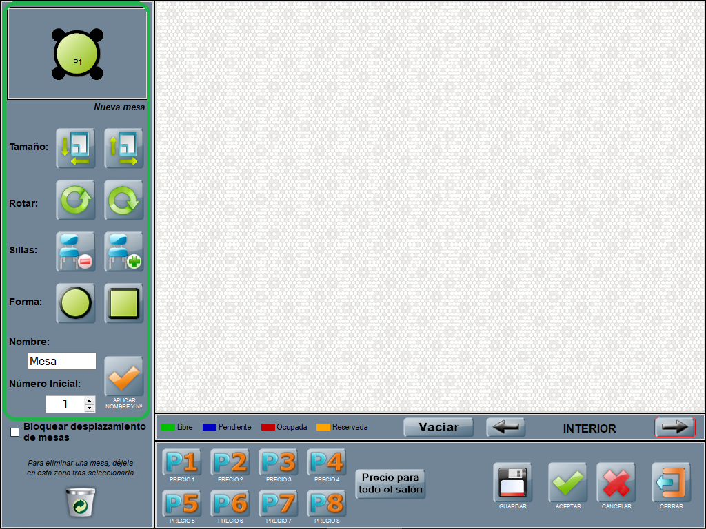 Menú de salón: utiliza las flechas para cambiar entre los diferentes salones que hayas configurado en Gestión de salones y mesas. El botón VACIAR, situado a la izquierda de este menú, sirve para eliminar todas las mesas del salón seleccionado.