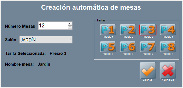 Se abre la ventana de creación automática de mesas, en la que tienes que indicar salón, tarifa y número de mesas a crear.