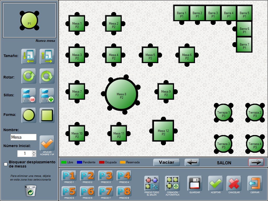 Barra de herramientas de edición de mesas: a la izquierda, contiene los botones para configurar las mesas. Contiene la vista previa de mesa nueva (arriba del todo), y varios botones para personalizar las mesas.