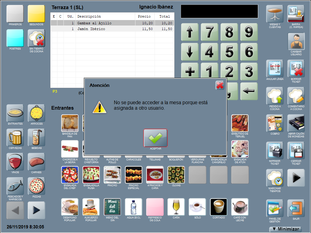 Si un usuario distinto al asignado intenta acceder a la mesa de otro usuario, Hosteltáctil® Pro avisa y no deja.