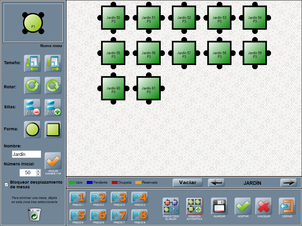 Para proceder a la creación automática de mesas con el salón vacío, utiliza el botón CREACIÓN AUTOMÁTICA situado en la ventana de creación de mesas.