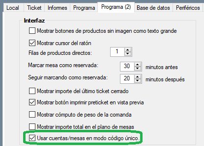 Para poder usar esta funcionalidad, tienes que activarlo en la configuración marcando la opción Usar cuentas/mesas en modo código único, desde Panel de gestión / Configurar opciones / Programa (2).