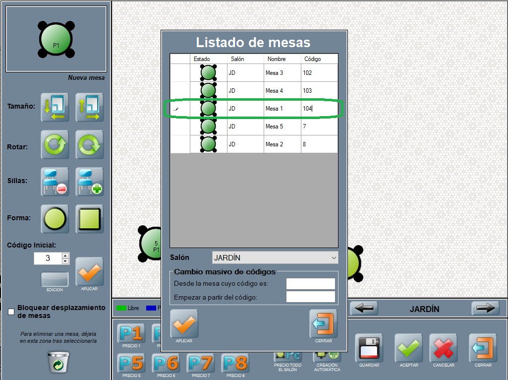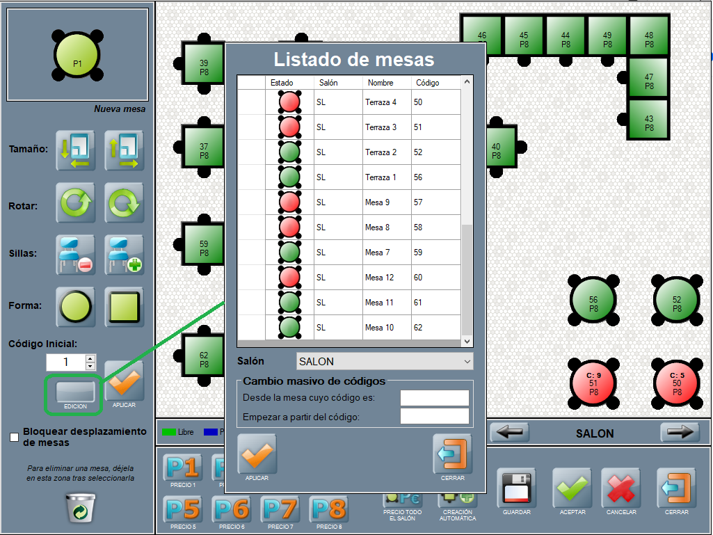 Más tarde, para cambiar los códigos asignados y según las instrucciones indicadas anteriormente en esta página, puedes desde la ventana de creación de mesas, utilizar el botón EDICIÓN, que abre la ventana del Listado de mesas.