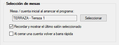 Mesa / cuenta inicial al arrancar el programa: puedes configurar la mesa por defecto en la que arrancará el programa al iniciar Hosteltáctil® Pro, para ello pulsa SELECCIONAR e indícala desde el plano de mesas.