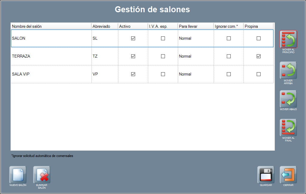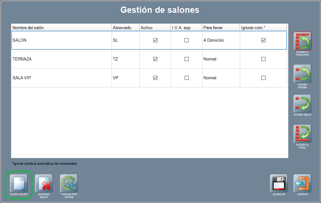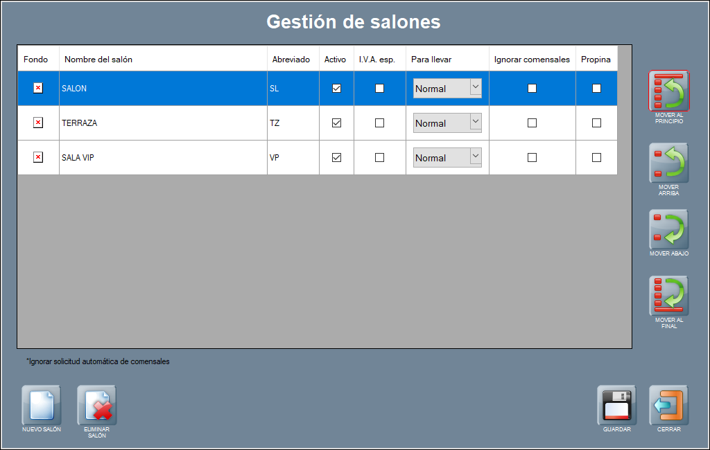 Activo: esta casilla define que sí se muestra el salón en la pantalla principal del programa, y que se puede operar con él. Desactívala para ocultar el salón, y actívala para utilizarlo.