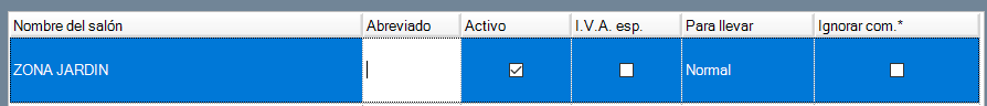 Abreviado: el nombre abreviado del salón, tal y como se mostrará en las comandas, en la vista previa de tickets, y en otros espacios reducidos. Es muy importante que las abreviaturas te permitan identificar el salón de forma rápida, pues se usan bastante durante la operativa del software.