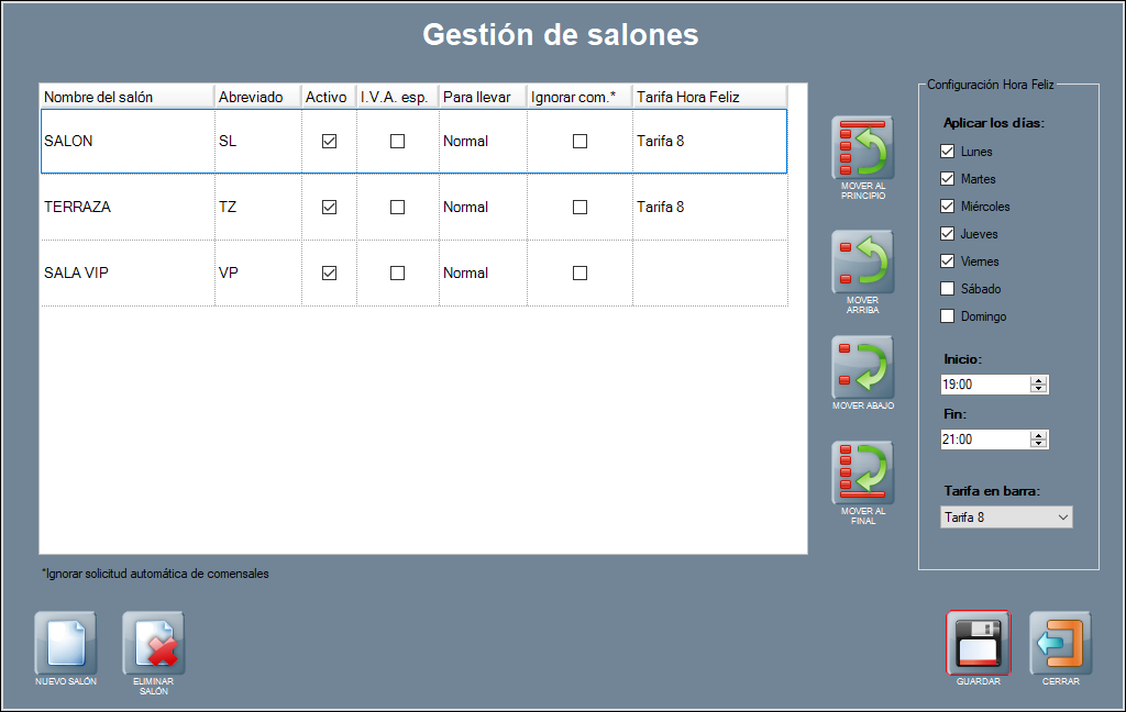 En la imagen de arriba, puedes ver que hay hora feliz de lunes de viernes, de 19.00 a 21.00 horas. Que se aplica la tarifa 8 en barra rápida, y en los salones llamados SALON y TERRAZA. En la SALA VIP, en este caso, no hay hora feliz.