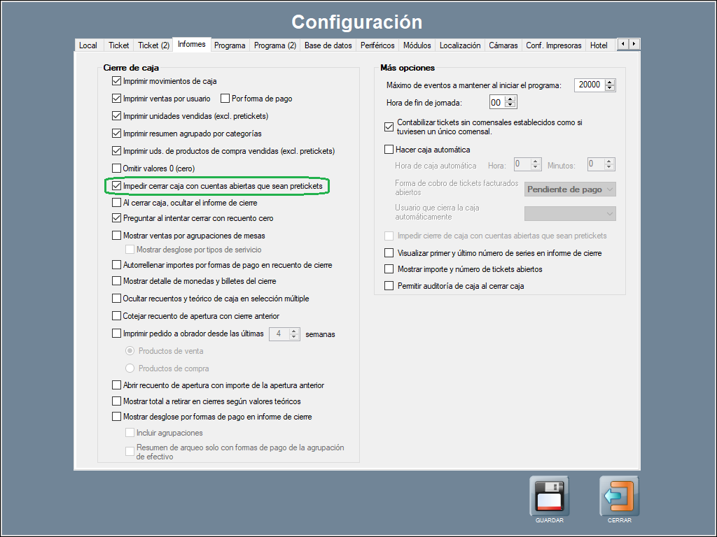 Para activar la opción Impedir cerrar caja con cuentas abiertas que sean pretickets, por favor, dirígete a la pestaña Informes en Panel de gestión / Configurar opciones.