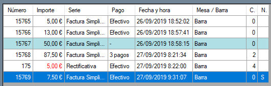 A destacar, que los importes de los tickets de la serie rectificativa tienen color rojo (para remarcar que son anulaciones); que las líneas con el fondo azul son tickets pendientes de cobro; y que si el ticket está fraccionado en varias formas de pago en el recuadro se indica (en la imagen, por ejemplo, para el tícket nº 15768: 3 pagos).
