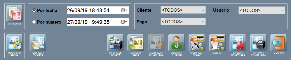 UNIFICAR TICKETS | Permite selección múltiple para unificar tickets a la misma u otra serie, con o sin traspaso de cobros. Sirve para facturaciones mensuales y similar. |