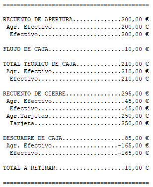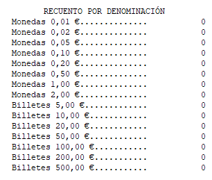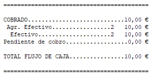 Resumen de arqueo solo con formas de pago de la agrupación de efectivo: lo mismo que la anterior, pero sólo para la agrupación de dinero en efectivo.