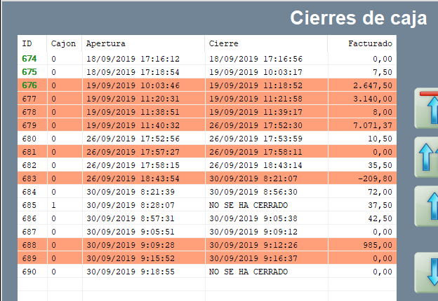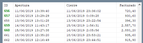 El listado de cierres de caja muestra el ID del cierre en cuestión, fecha y hora de apertura, fecha y hora de cierre y el valor facturado. Recuerda que al pulsar sobre el encabezado de la fila puedes ordenarlo, como ya debes saber, por otras partes de esta guía.