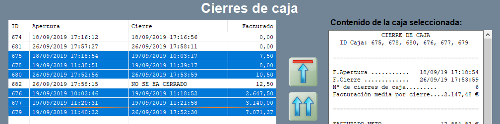 Si lo que quieres es trasladar lo que estás viendo en pantalla a papel, utiliza IMPRIMIR TABLA: se imprimirá un reporte por líneas de cierres de caja, con su ID, fechas de apertura y cierre, y total facturado.