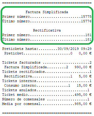 En el informe de cierre de caja se muestra el primer y último ticket de la caja. En el caso de haber varias cajas implicadas y que los tickets no sean correlativos se indica en el mismo informe.