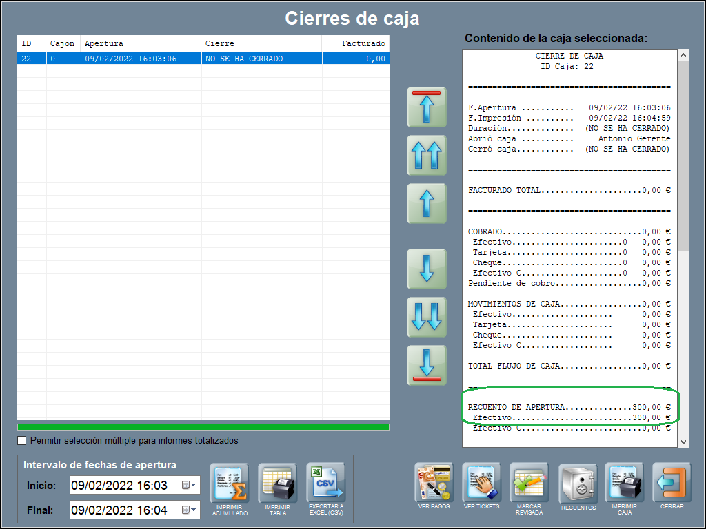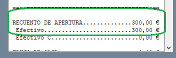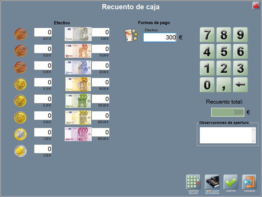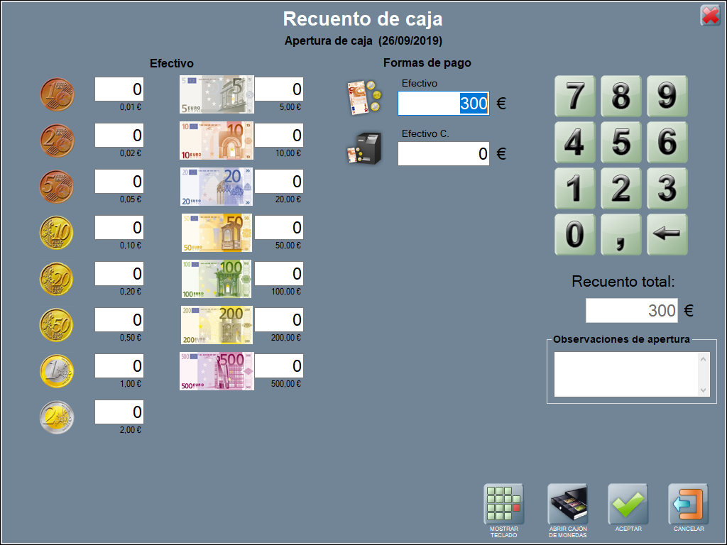 Se abre caja con un recuento de apertura de 300,00 € en efectivo.