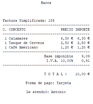 La Factura Simplificada 185 tiene un importe de 10,00 € y se ha cobrado con la forma de pago tarjeta.