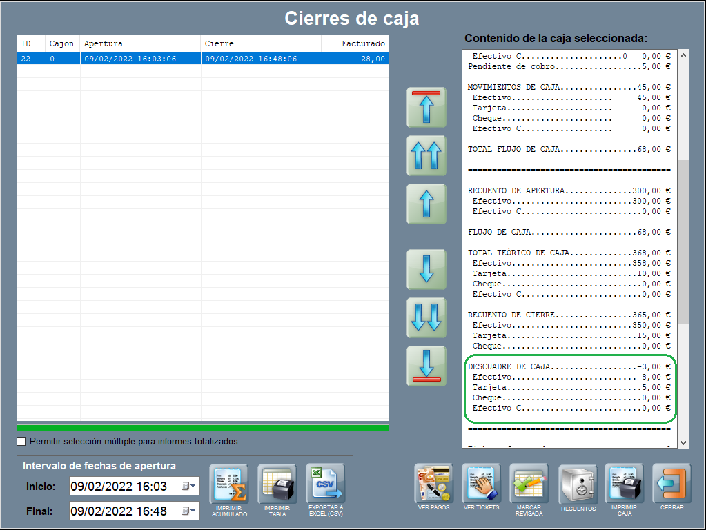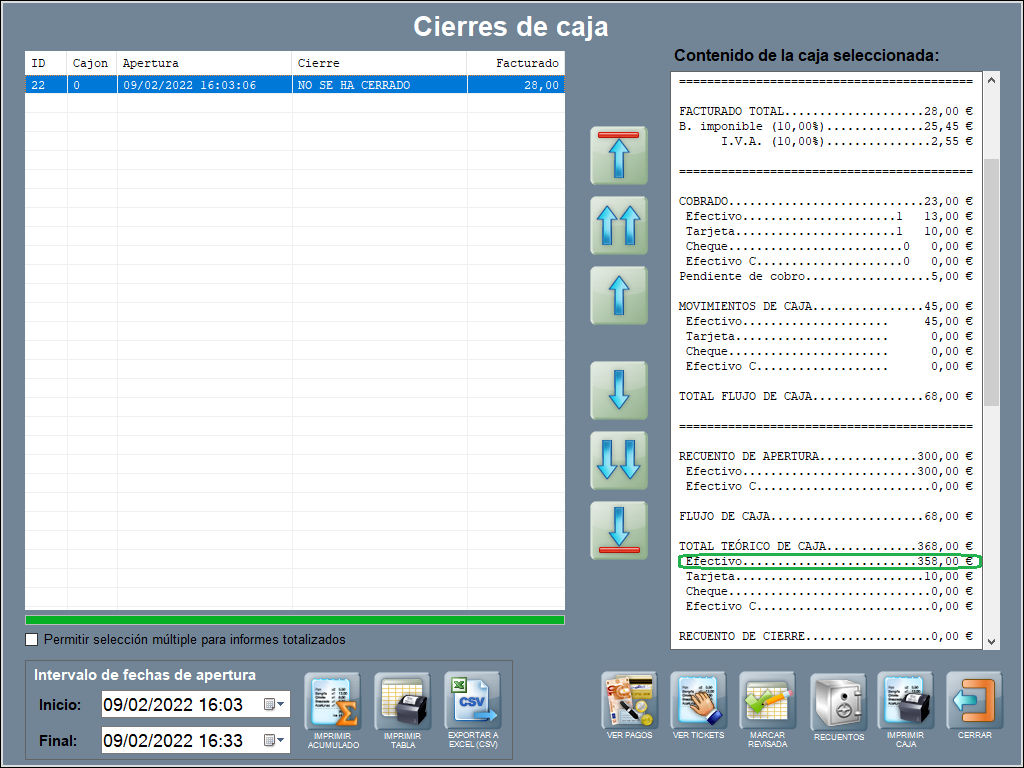 Con este botón en concreto, podrás tanto reimprimir cajas ya cerradas, como imprimir un informe con el valor de lo que se lleva facturado hasta el momento, en una caja que todavía no ha sido cerrada (sacar un X).